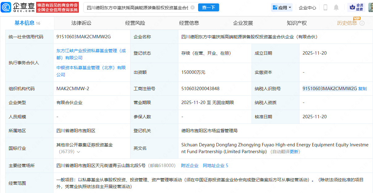 近日,四川德阳东方中瀛扶摇高端能源装备股权投资基金合伙企业(有限合伙)成立,出资额15亿元,经营范围包含:以私募基金从事股权投资、投资管理、资产管理等活动。企查查股权穿透显示,该公司由中国银行(601988)全资子公司中银金融资产投资有限公司、东方电气投资管理有限公司等共同持股。